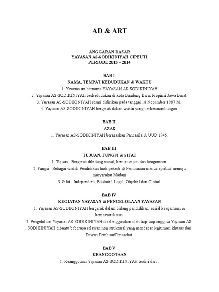 Contoh adart yayasan as sodikiniyah ad art. Yayasan ini bernama yayasan as sodikiniyah 2. Untuk membantu merealisasikan tugas tugas tersebut diperlukan acuan dan peraturan dalam bentuk anggaran dasaranggaran rumah tangga adart sebagai berikut. Ad art yayasan pendidikan 2. Yayasan didirikan untuk jangka waktu yang tidak ditentukan lamanya. Ad art serikat petani indonesia 0.