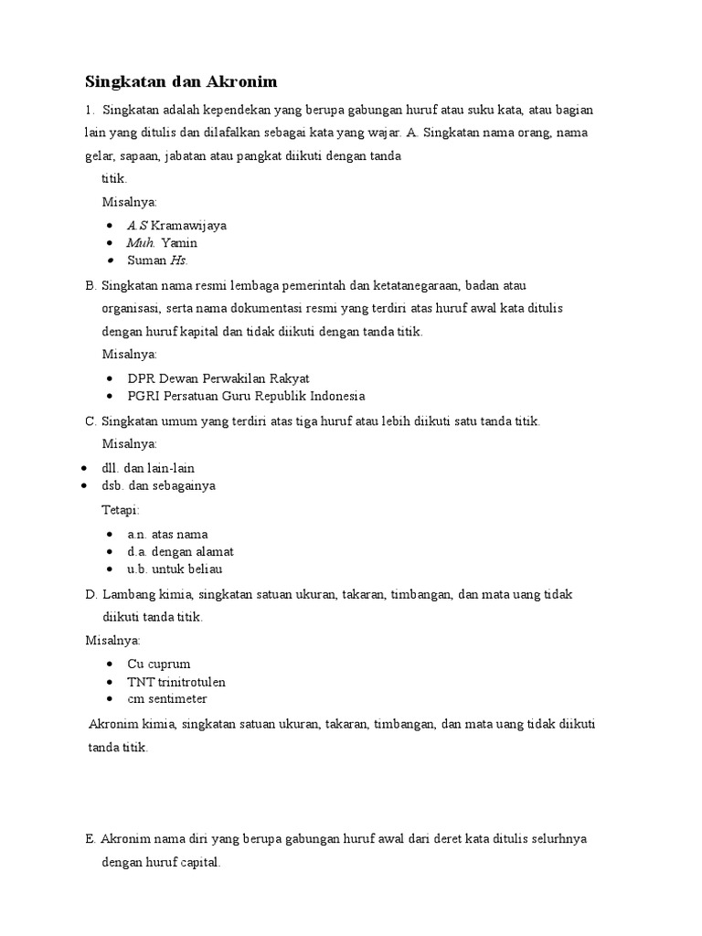 Contoh akronim dan singkatan. Kalimat berikut yang menggunakan penulisan singkatan dan akronim sesuai eyd adalah. Singkatan merupakan bentuk pemendekan kata atau kalimat yang terdiri dari satu huruf atau lebih yang dieja menurut huruf pembentuknya atau dapat juga diartikan sebagai gabungan huruf dari dua kata atau lebih yang dilafalkan menjadi satu kata wajar. Akronim adalah singkatan yang mengambil dua atau lebih huruf dari kata yg disingkat diperlakukan sebagai kata contoh. Singkatan dan akronim tentu sudah tidak asing dari pendengaran kita. Sedangkan akronim ialah singkatan yang berupa gabungan huruf awal gabungan suku kata. Pengertian contoh dan macam macam akronim konon kepopuleran sebuah akronim dapat menyebabkan hilangnya kata yang diakronimkan.