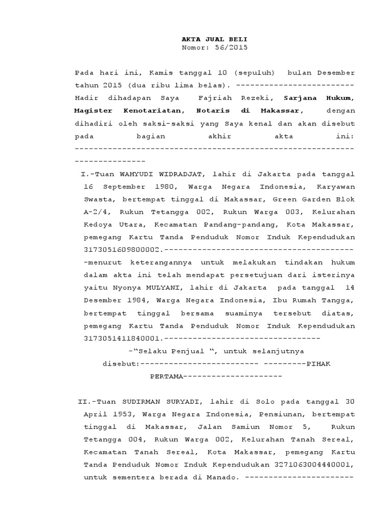 Akta jual beli contoh 1. Jika harga jual beli tanah belum dibayar lunas maka pembuatan ajb belum dapat dilakukan. 33 contoh surat jual beli tanah sawah. Pada hari ini kamis tanggal 29 juli 2019 telah disepakati transaksi jual beli sebidang tanah berikut bangunannya yang terletak di perumahan telaga mas blok 8a no. 300 desa sungai selo kecamatan sengklek kabupaten banyumas dengan pihak pihak sebagai berikut. 35 contoh surat perjanjian jual beli mobil.