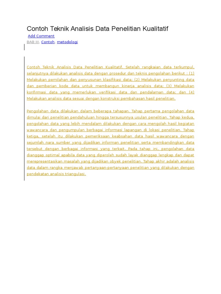 Contoh analisis data penelitian. Maka hasil dari interpretasi yang diperoleh pun tidak sempurna bahkan dapat berakibat fatal. Penelitian kualitatif selalu bersifat terbuka terhadap temuan lapangan oleh karena itu proses analisis data hampir tidak pernah berhenti di satu titik. Wawancara ekstensif dan observasi partisipatif mengarah pada narasi yang perlu diatur sedemikian rupa sehingga proses analisisnya bisa sistematis dan ilmiah. Teknik analisis data kualitatif adalah proses inspeksi pembersihan transformasi dan pemodelan pengumpulan data dengan tujuan menemukan informasi yang berguna sampai pada tahap pembuatan kesimpulan kesimpulan guna mendukung proses pengambilan keputusan. Analisis data penelitian merupakan proses pengumpulan data menggunakan penalaran analitis dan logis untuk memeriksa setiap komponen data yang disediakan. Berikutnya saya akan mengulas tentang teknik analisis data kualitatif dengan pendekatan teori grounded grounded theory.