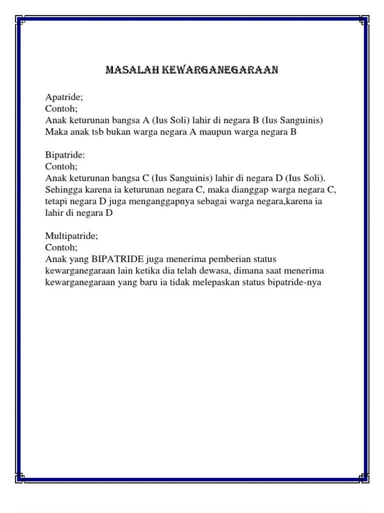 0260 7541998 kata pengantar segala pujii syukur saya panjatkan kehadirat allah. Seseorang akan mengalami kasus apatride jika dia atau orang tuanya telah melairkannya di negara yang memiliki faham ius sanguinis namun orang tuanya adalah orag yang berasal dari negara yag.