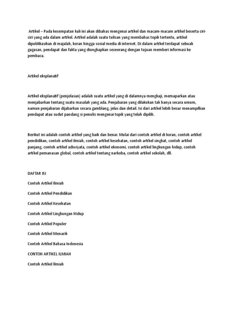 Karena kalau bahasa indonesia yang baik dan benar terlalu formal. Maka hampir setiap hari kita selalu membaca sebuah artikel dengan berbagai tema baik itu pendidikan kesehatan ilmiah dan lain lain. Lebih cocok untuk remaja. Sumandiria menurut sumandiria artikel adalah suatu karya tulis lepas berisikan sebuah opini seseorang yang sudah mengetahui secara jauh tentang masalah atau objek yang bersifat aktual dengan tujuan untuk memberitahukan. Contoh artikel ilmiah ahmad sarjita. Di bawah ialah contoh dari artikel ilmiah.