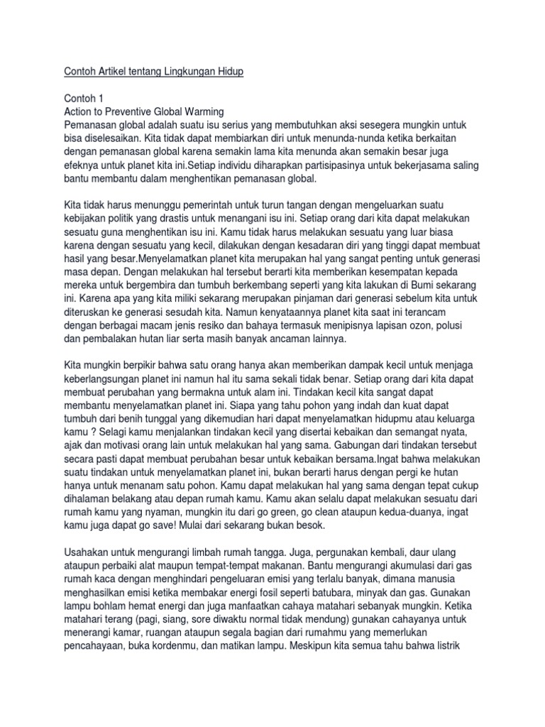 Contoh artikel tentang lingkungan hidup. Lingkungan hidup adalah segala sesuatu yang berkaitan dengan keberlangsungan hidup kita dan itu artinya baik atau sehat tidaknya hidup kita juga sangat ditentukan. Berbagai bentuk bencana alam yang akhir akhir ini banyak melanda indonesia telah menimbulkan dampak rusaknya lingkungan hidup. Demikianlah contoh artikel lingkungan hidup tentang pemanasan global. Pengertian lingkungan hidup manusia hewan dan tumbuhan adalah bagian dari komponen penyusun lingkungan hidup kita yang satu sama lain saling mempengaruhi. Artikel paling populer tersebut disusun berdasarkan kategori kategori utama yang terdapat di blog ini. Contoh artikel tentang lingkungan hidup.