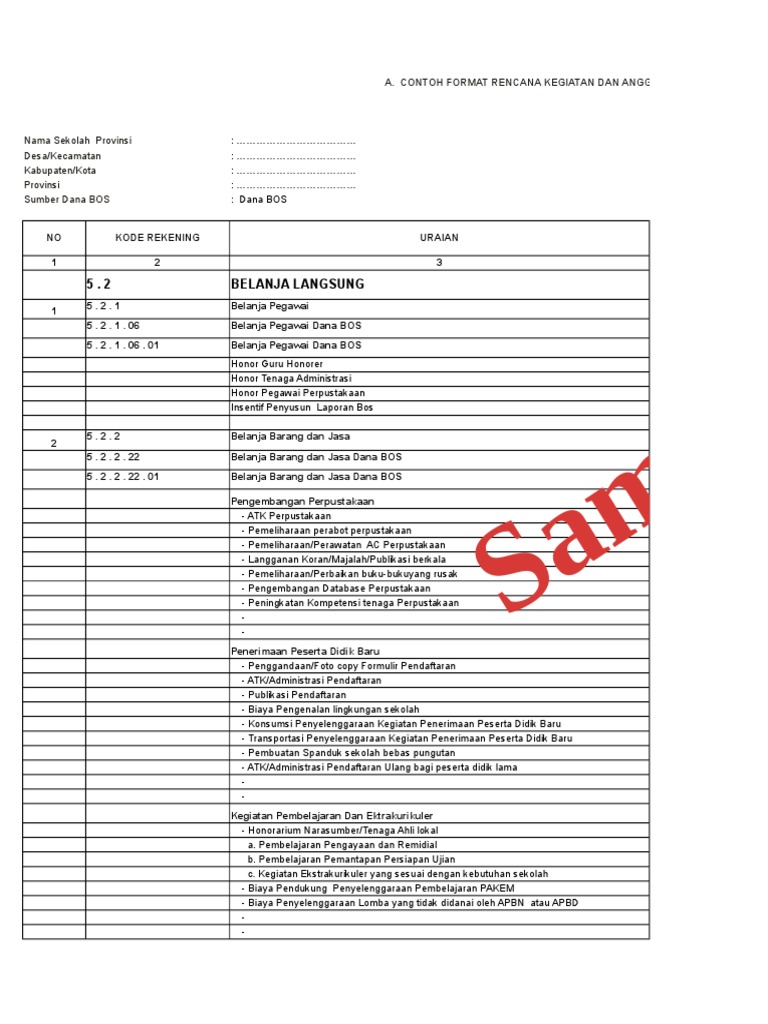 Contoh belanja barang dan jasa bos. Diatas merupakan contoh dari uraian penggunaan dana bos yang mengacu kepada 8 standar pendidikan dan 12 komponen pengeluaran bos lebih lengkap dapat melihat preview di bawah ini. Belanja barang dan jasa merupakan pengeluaran yang antara lain dilakukan untuk membiayai keperluan kantor sehari hari pengadaan barang yang habis pakai seperti alat tulis kantor pengadaanpenggantian peralatan kantor yang nilainya tidak memenuhi syarat nilai kapitalisasi minimum langganan daya dan jasa lain lain pengeluaran untuk membiayai pekerjaan yang bersifat non fisik dan secara. Tentang pembentukan tim pelaksana pengadaan barang dan jasa dari bantua oprasional sekolah periode januari desember tahun 2019. Barangjasa belum tersedia dalam e catalogue yang diselenggarakan oleh lkpp atau sudah tersedia dalam e catalogue namun sekolah tidak dapat mengaksesnya maka sekolah dapat melakukan pembelian atau pengadaan dengan cara belanja biasa yaitu melakukan perbandingan harga penawaran dari penyedia barangjasa terhadap harga pasar dan melakukan negosiasi. Uraian yang terdapat dalam rkas bos 2020 permendikbud nomor 8 tahun 2020 terdiri dari belanja pegawai maksimal 50 dengan syarat sudah memiliki nuptk tercatat di dapodik pertanggal 31 desember 2019 dan tidak untuk membiayai guru honor baru dari jumlah dana bos pertahun belanja barang dan jasa seperti bayar listrik bayar pulsa internet langganan koran biaya upah tukang dan semua biaya. Kompensasi dalam bentuk uang maupun barang yang diberikan kepada pegawai negeri pejabat negara dan pensiunan serta pegawai honorer yang akan diangkat sebagai pegawai lingkup pemerintahan baik yang bertugas di dalam maupun di luar negeri sebagai imbalan atas pekerjaan yang telah dilaksanakan.