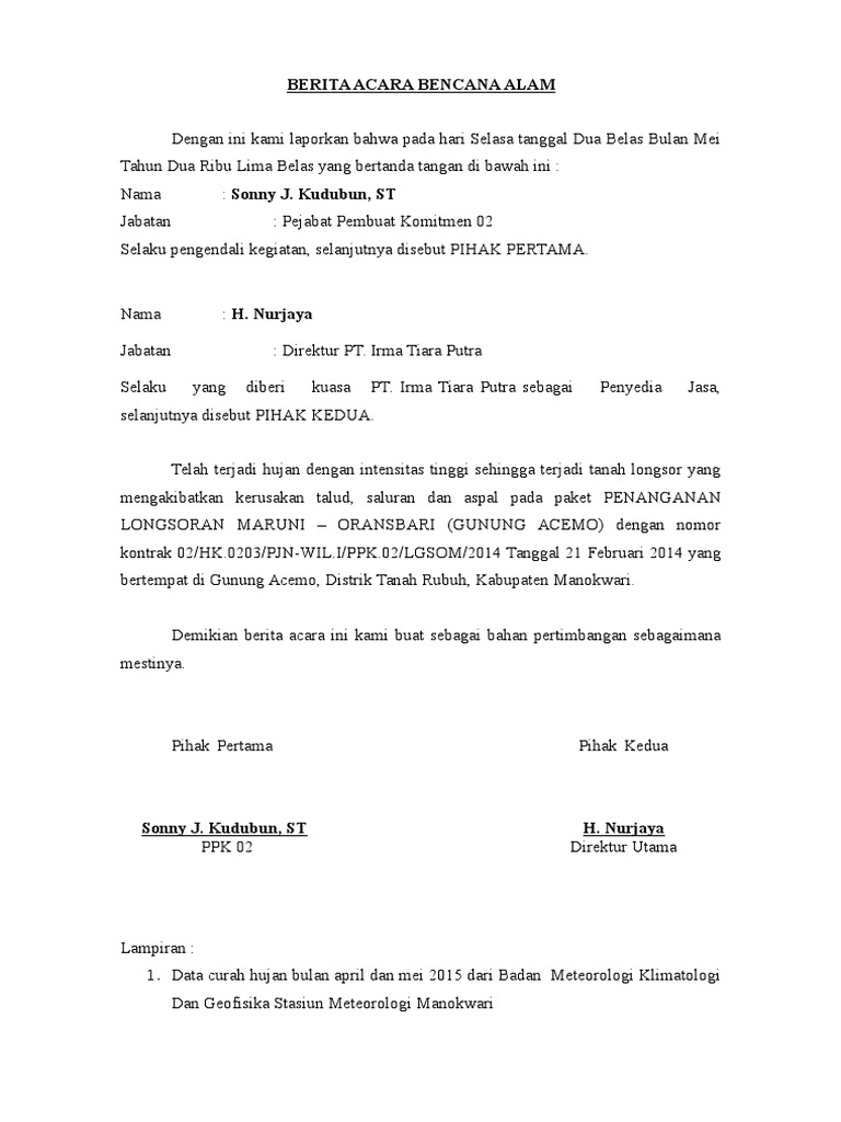 Contoh berita acara berita acara merupakan bukti legal yang didalamnya mengandung suatu pengesahan atau pernyataan di dalam sebuah acara kejadian atau peristiwa serah terima jual beli transaksi insiden dan masih banyak lagi yang lainnya. Tapi diharuskan menunjukkan bukti otentik dari setiap kegiatan di luar kantor oleh si bos. Contoh contoh yang akan dipaparkan di bawah ini terdiri dari jenis contoh berita acara rapat serah terima kejadian kehilangan serah terima sebuah pekerjaan kerusakan barang acara kehilangan dokumen penting acara kegiatan sekolah contoh untuk jenis berita acara pemeriksaan dan masih banyak lagi yang lainnya. Contoh berita acara tersebut benar benar diperlukan untuk mereka yang mengalami kesusahan dalam membikinnya atau juga malahan yang masih belum tahu dan paham apa itu berita acara. Contoh berita acara berita acara adalah bukti legal yang berisi pengesahan dan pernyataan pernyataan dalam suatu acara peristiwa atau kejadian serah terima insiden jual beli dan transaksi. Berita acara ini biasanya mempunyai fungsi sebagai bukti legal suatu kejadian atau transaksi tertentu.