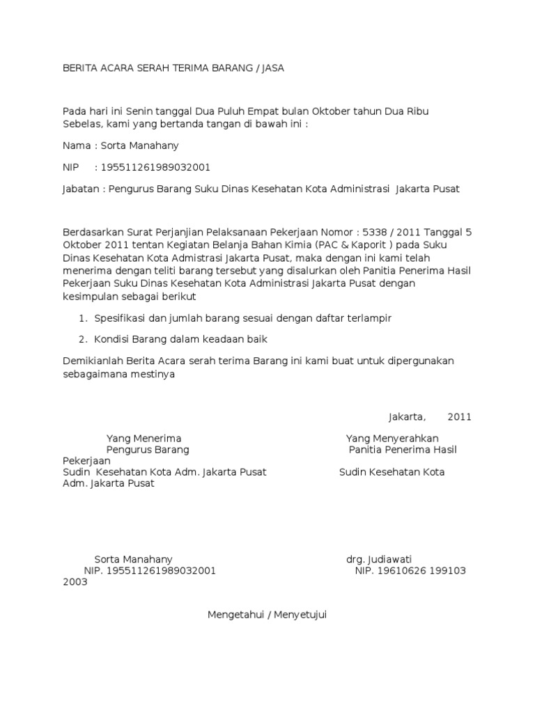 Contoh berita acara serah terima barang dinas. 15 contoh surat berita acara berbagai kegiatan dan keperluan dalam menjalankan sebuah perusahaan atau instansi tentu saja semuanya tidak bisa dilakukan oleh seorang pimpinan. Dalam semua instansi pemakaian berita acara serah terima untuk kedinasan sangat diperlukan karena sebagai landasan utama dalam berkinerja termasuk dalam audit pengadaan keuangan kinerja dan akuntabilitas. Kediri 29 juni 1992. Halo sobat nehanesia apakah anda sedang mencari contoh surat berita acara serah terima barang. Dengan mengetahui namanya tentu anda sudah bisa menebak bahwa di dalam surat ini nantinya berhubungan dengan barang yang dikirim dan diterima oleh seseorang yang melakukan transaksi pengiriman barangbiasanya surat ini akan diselipkan atau dibawakan kepada seseorang yang bertugas untuk mengirimkan barang tersebut. Contoh berita acara serah terima dinas.