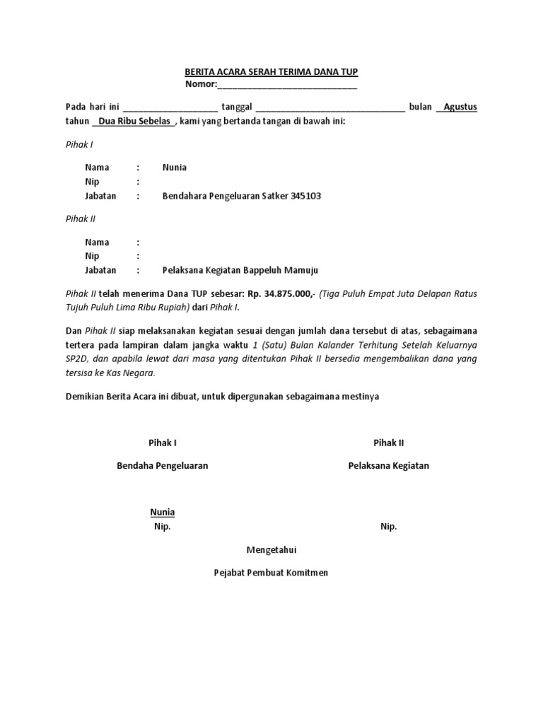 Demikianlah berita acara serah terima barang ini di perbuat oleh kedua belah pihak adapun barang barang tersebut dalam keadaan baik dan cukup sejak penandatanganan berita acara ini maka barang tersebut menjadi tanggung jawab pihak kedua memlihara merawat dengan baik serta dipergunakan untuk keperluan tempat dimana barang itu dibutuhkan. Secara kebetulan saya sedang membutuhkan contoh berita acara penyarahan modal usaha untuk bumdes. Contoh surat pernyataan tanda terima uang terlepas dari itu tidak menutup kemungkinan untuk menyusun sebuah kata yang nantinya akan membentuk sebuah kalimat yang akan menjadi isi pada berita acara serah terima uang tersebut. Berita acara serah terima uang tak hanya berfungsi sebagai alat pembuktian saja namun juga bisa digunakan untuk memonitoring transparansi dana. Contoh berita acara serah terima uang kas tunai dari bendahara hasanusi. Berita acara serah terima uang.
