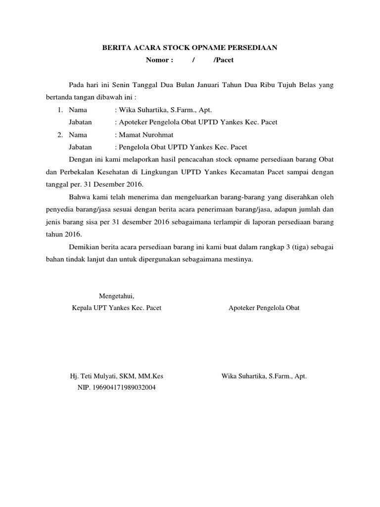 Contoh berita acara stock opname barang persediaan. Per 30 juni 2013. Pada hari ini sabtu tanggal dua puluh sembilan bulan juni tahun 2013 yang bertanda tangan di bawah ini kami. Irwanto nip 19731115 199903 1 004 nip. Pada hari ini selasa tanggal duapuluh sembilan bulan desember tahun duaribu limabelas kami yang bertanda tangan dibawah ini selaku penyimpan barang dan atasan langsung penyimpan barang pada sd negeri borobudur 2 kecamatan borobudur kabupaten. Pembagian lokasi stock opname. Persiapan stock opname yaitu dengan menghentikan seluruh pergerakan barang.