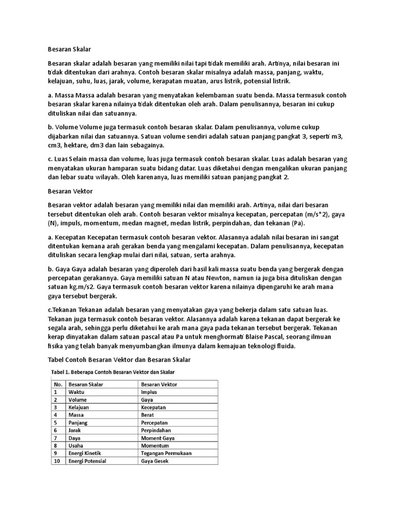 Contoh besaran vektor dan skalar. Kalau kelajuan termasuk besaran skalar misalnya mobil sedang melaju 30 kmjam. Berbeda dengan besaran skalar besaran vektor selain memiliki nilai juga memiliki arah. Dapat disimpulkan bahwa semua besaran pokok termasuk besaran skalar. Besaran skalar adalah besaran yang hanya memiliki nilai dan tidak memiliki arah. Besaran vektor adalah besaran fisika yang memiliki nilai dan arah. Sementara contoh besan vektor adalah pergeseran perpindahan kecepatan percepatan gaya dt berat.
