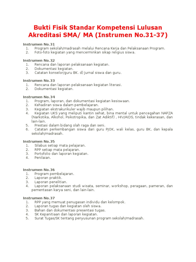 Bukti fisik yang dimaksud adalah administrasi perangkat dokumen akreditasi yang harus disediakan dalam kegiatan visitasi. Bukti fisik akreditasi sd 2018 standar kompetensi lulusan instrumen 32 38 ini merupakan dokumen yang harus dipersiapkan dalam menghadapi akreditasi sd 2017.