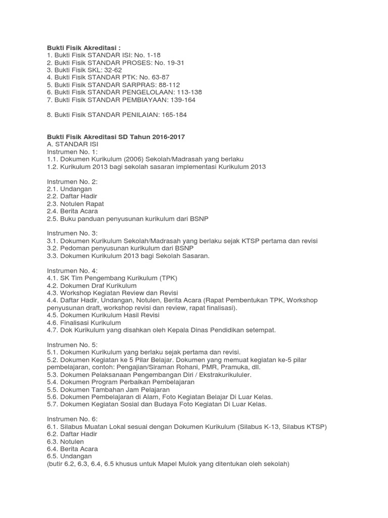 Contoh bukti fisik standar isi akreditasi sd 2017. Instrumen 1 10 lengkap dengan penjelasannya. Akreditasi sekolah merupakan kegiatan yang harus dilaksanakan oleh badan akreditasi nasional standar minimal ban sm. Berdasarkan pada 8 standar nasional pendidikan maka disini saya sediakan lengkap untuk. Bukti fisik akreditasi sd 2017 ini merupakan file terbaru bukti fisik yang dimaksud adalah administrasi perangkat dokumen akreditasi yang harus disediakan dalam kegiatan visitasi. Bukti fisik akreditasi sd 2018 standar isi instrumen 1 10 ini merupakan dokumen yang harus dipersiapkan dalam menghadapi akreditasi sd 20. Segera download perangkat akreditasi smp 2017.