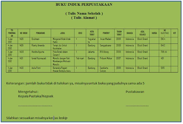 Untuk impresum mencakup tempat terbit penerbit dan tahun terbit saya kira itu juga mudah tinggal anda lihat saja dibukunya. 1 nomor. Contoh jam layanan perpustakaan sekolah. Format buku induk perpustakaan. Softgaleri adalah blog yang berbagi informasi perangkat akreditasi paket sdmi smpmts smasmkma slb sederajat administrasi kelasakreditasi sekolahperangkat pembelajaran aplikasi dan administrasi guru yang mana file berikut ini adalah kumpulan dari berbagi sumber tentang format buku induk perpustakaan yang bisa bapakibu gunakan dan. Tasikmalaya tgl penerimaan no induk pengarang judul edisi kota terbit penerbit tahun terbit bahasa asal koleksi harga no klasifikasi ket 4 jan 2012 1428 dzulmani mengenal kitab kitab hadis 1 yogyakarta insan madani 2008 indonesia block grand 2xz4 4 jan 2012 1429 rianty amanda terapi jus untuk kesehatan 1 bandung sanggabuana 2008.