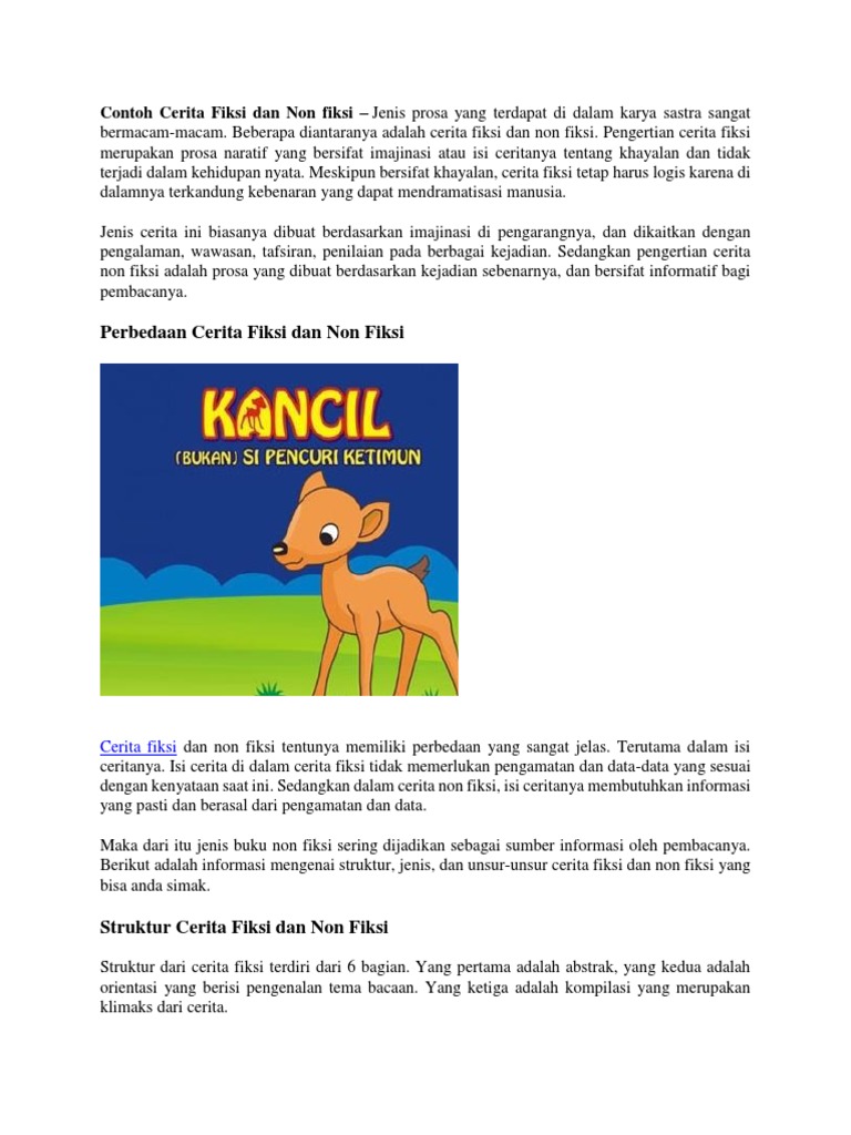 Contoh cerita non fiksi. Contoh cerita non fiksi cerita non fiksi merupakan sebuah cerita yang bersifat sangat informatif. Semoga dapat bermanfaat dan dapat menambah wawasan kamu tentang bagaimana caranya meresensi buku non fiksi yang baik dan benar. Biasanya cerita fiksi dalam bentuk tulis di tuangkan dalam cerpen cerita pendek dan novelnamun cerita fiksi bisa terapkan di media lain seperti sandiwarakomikdan film. Pengertian cerita fiksi merupakan prosa naratif yang bersifat imajinasi atau isi ceritanya tentang khayalan dan tidak terjadi dalam kehidupan nyata. Pada cerita non fiksi ini pengarang memiliki tanggung jawab akan kebenaran meskipun hanya sebuah itikad. Semoga terinspirasi dari kisah kisah nyata disekitar kita.