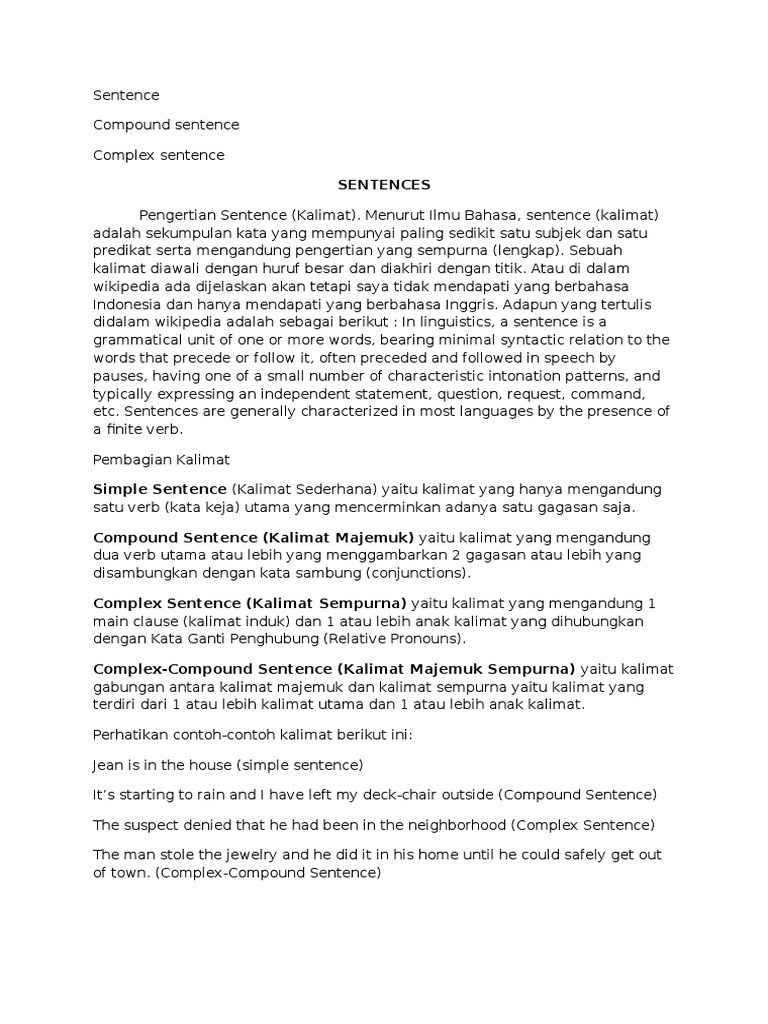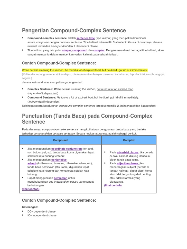 Contoh compound complex sentence. Belajar bahasa inggris grammar kalimat simple compound dan complex sentence adalah 3 macam kalimat bahasa inggris yang harus dipelajari terutama bagi yang ingin lebih memperdalam dan mengerti contoh discussion text argumentative dan jenis teks lainnyapengertian sekaligus contoh kalimat simple compund dan complex sentence menduduki porsi terbesar dalam mendapat perhatian ketika ingin. Compound complex sentence adalah sentence type tipe kalimat yang merupakan kombinasi antara compound sentence dan complex sentencetipe kalimat ini memiliki 3 atau lebih klausa di dalamnya dimana minimal ada 2 independent clause dan 1 dependent clause. Contoh kalimat complex sentence. Soal sentence types pengertian compound complex sentence. Contoh kalimat complex sentence dependent clause independent clause dan complex sentence. Secara umum rumus dari jenis kalimat ini dapat dilihat dibawah ini namun rumus ini dapat berubah polanya bisa disesuaikan dengan jenis klausa yang digunakan.