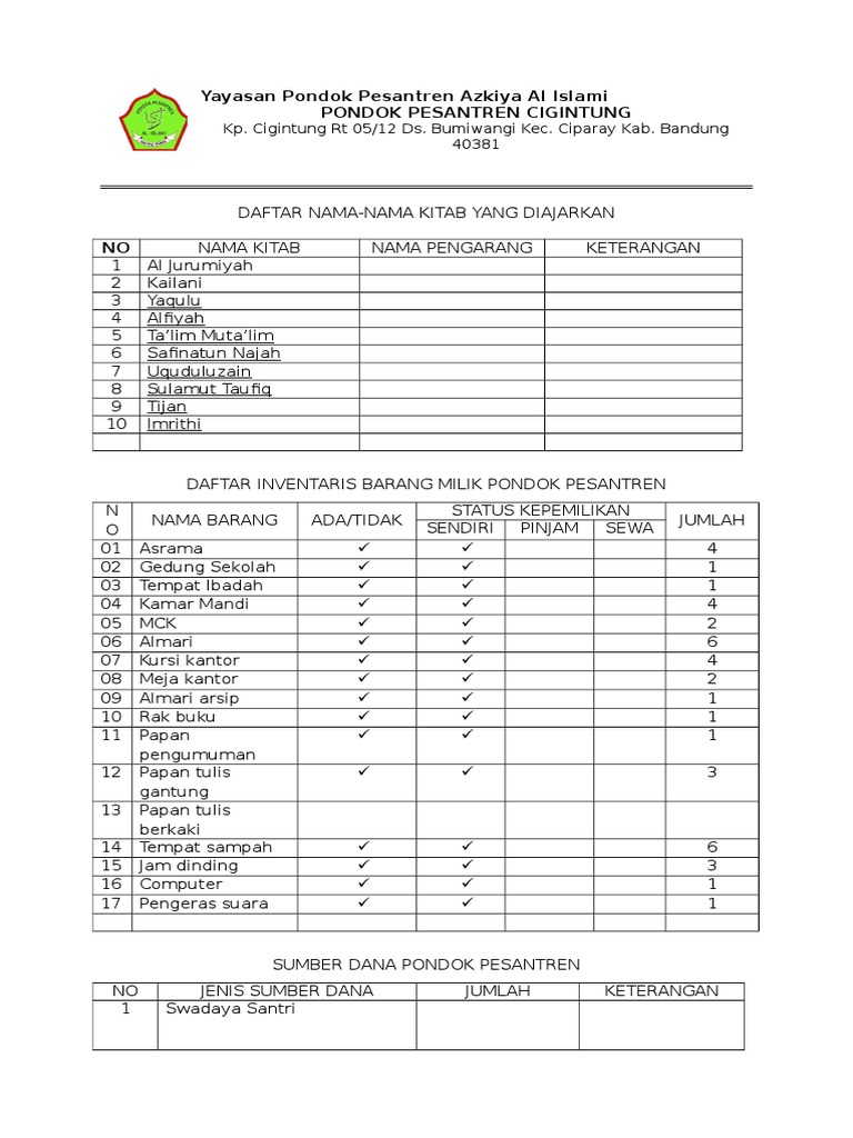 Contoh daftar inventaris barang perusahaan. Tujuannya untuk menganalisis alat penunjang aktivitas perusahaan kekayaan dan modal. Inventaris atau inventarisasi barang adalah semua kegiatan dan usaha untuk memperoleh data yang diperlukan tentang ketersediaan barang barang yang dimiliki dan diurus baik yang diadakan melalui pembelian menggunakan anggaran belanja maupun sumbangan atau hibah untuk diadministrasikan sebagaimana mestinya menurut ketentuan dan cara yang telah ditetapkan di masing masing instansi. Membuat daftar rekapitulasi tahunan laporan triwulan mutasi barang inventaris yaitu daftar tempat mencatat penambahan dan pengurangan barang inventaris pada suatu organisasi selama triwulan yang bersangkutan. Download format laporan inventaris barang format excel ini dibagikan secara gratis untuk pengelola aset sekolah jenjang sd smp sma smk ma mts dan mi. Contoh format laporan inventaris barang lengkap ini ditujukan bagi siapa saja yang membutuhkan informasi pendidikan aplikasi dan administrasi untuk digunakan sebagai referensi sesuai keperluan baik itu di lingkungan kelas dan sekolah ataupun umum untuk guru bahkan operator sekolah dan tenaga usaha tu. Contoh administrasi pengelolaan inventaris sekolah lengkap merupakan laporan pembukuan yang mencakup fasilitas sekolah silahkan dapatkan filenya dengan cara download contoh format laporan pengelolaan inventaris barang sekolahcontoh buku inventaris barang ini bertujuan untuk menambah bahan referensi anda supaya mudah.