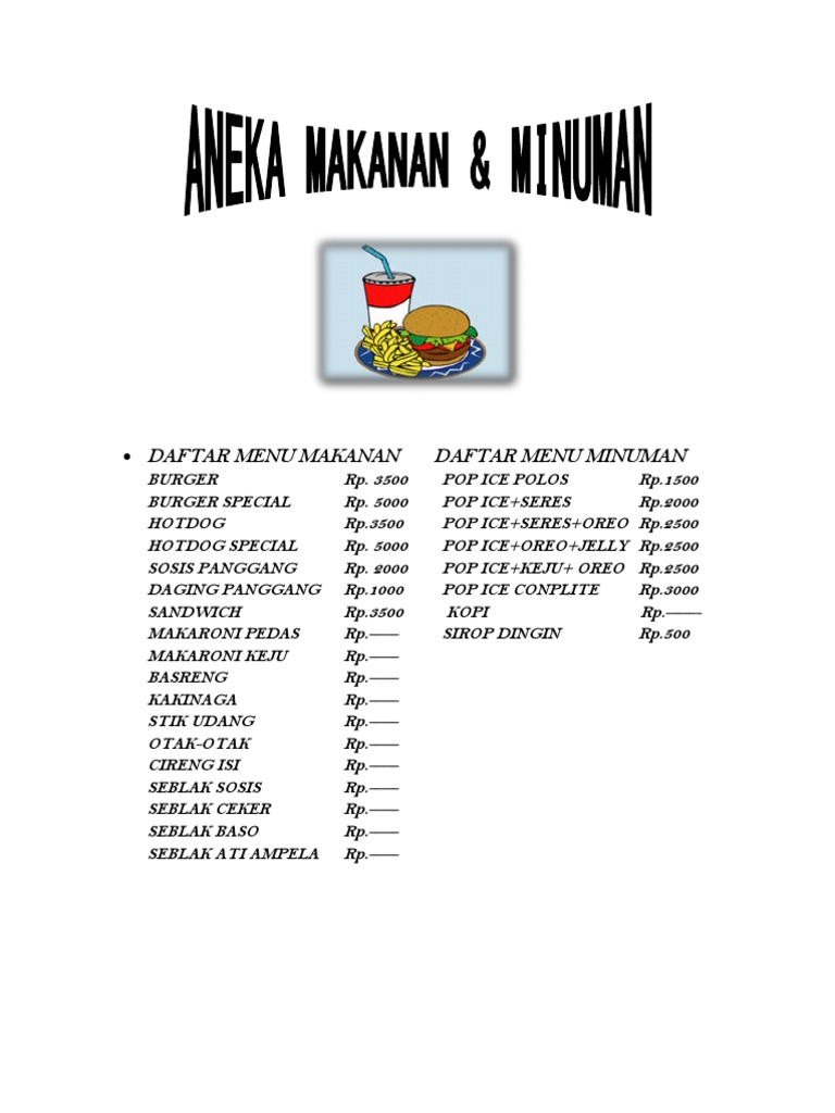 Contoh daftar menu minuman. 18 jenis minuman favorit yang biasa disajikan di cafe sesuai dengan karakteristik bahan dan penyajiannya. Pid agency restoran hubungi kami di 021 2936 1718. 10 contoh menu makanan sederhana wajib untuk cafe anda plus resepnya. Jika sudah mendapatkan yang seusai dengan keinginan silahkan download dengan cara klik tombol free download yang tersedia. Bagaimana cara membuat target goal setting tujuan hidup yang terbaik dan benar. Halo sobat ibi semua pada kesempatan kali ini kita akan membahas tentang daftar menu di restaurant dalam bahasa inggris.
