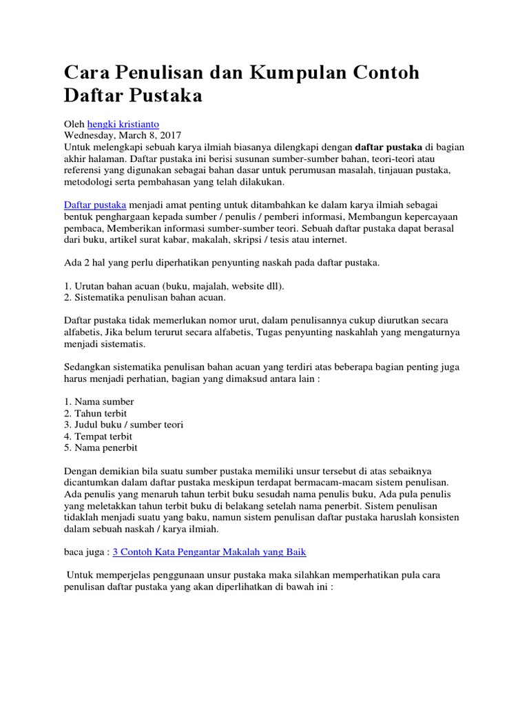 13 contoh daftar pustaka panduan cara menulis tata cara buku karya ilmiah by arifin saddoen contoh daftar pustaka bagi seseorang yang tengah menuntut ilmu khususnya seorang mahasiswa tentunya daftar pustaka merupakan suatu kosa kata yang akrab terdengar di telinga. Contoh daftar pustaka terkadang juga diperlukan bagi mereka yang sedang mengerjakan tugas akhir skripsi atau pun karya ilmiah lainnya. Penulisan daftar pustaka memiliki cara yang baku tetapi tidak mengikat karena setiap sumber atau karya tulis yang digunakan biasanya beragam. Penjelasan cara menulis daftar pustaka. Penulisan daftar pustaka secara umum terdiri atas nama penulis tahun terbit judul tulisan identitas penerbit dan lokasi penerbit yang ditulis urut secara abjad dari atas ke bawah. Daftar pustaka ada pada semua jenis karya tulis ilmiah seperti buku skripsi makalah artikel dan sebagainya.