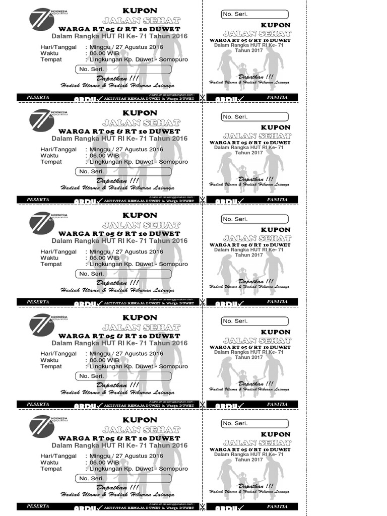 Contoh desain kupon jalan sehat. Download kupon undian. Desain kupon disini terdiri dari beberapa elemen seperti logo resmi hut ri ke 74 bendera merah putih foto presiden ir. Lomba 17 agustus vector. Kupon adalah cara hebat untuk menarik pelanggan baru meningkatkan lalu lintas kunjungan memuaskan pelanggan yang sudah ada atau sekadar memperkenalkan nama anda. Lomba 17 augustus vector marketing lomba 17 augustus vector security lomba 17 augustus vector magic lomba 17 augustus vector file lomba. Perayaan kemerdekaan republik indonesia ini tak hanya berlangsung satu hari saja namun bisa sampai satu bulan penuh pada bulan agustusoleh karena itu pada kesempata ini admin akan membagikan contoh desain kupon kegiatan jalan sehat dalam rangka peringatan hut republik indonesia ke 74 berformat coreldraw atau cdr.