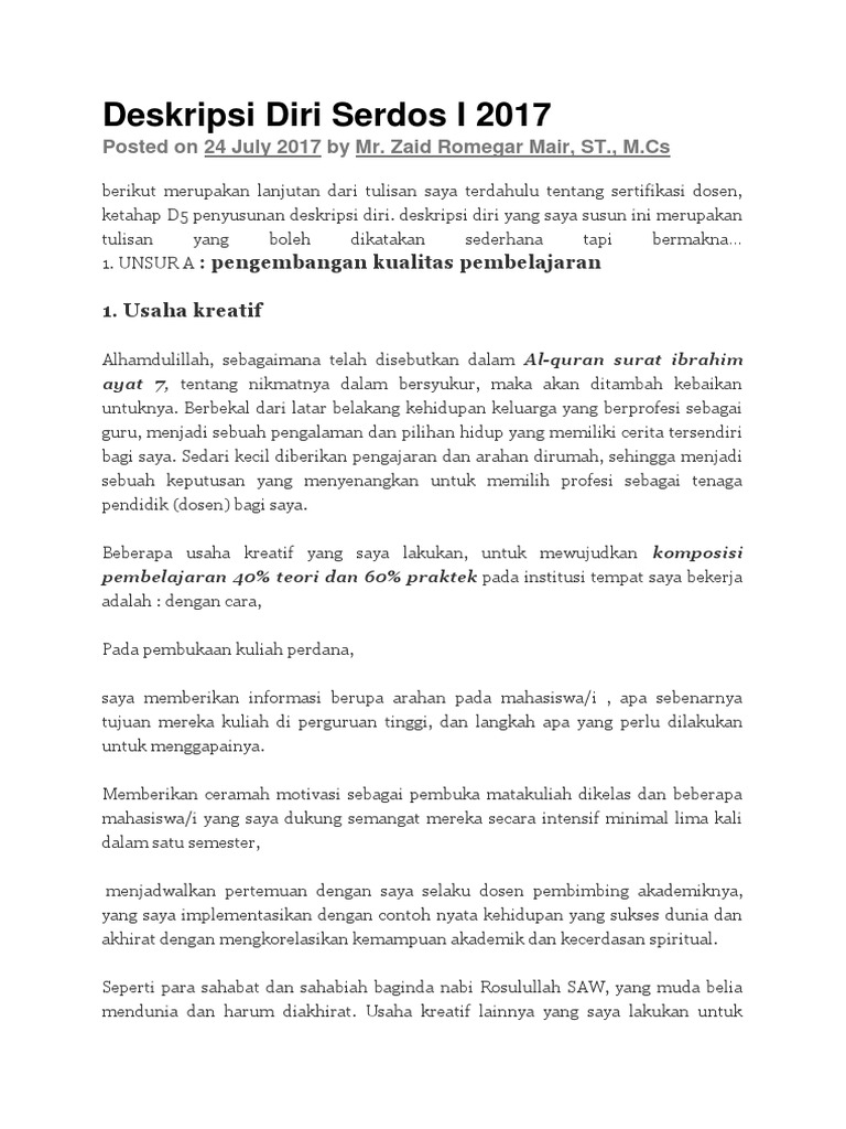 Deskripsi diri serdos i 2017 by zaidmair on monday july 24 2017 berikut merupakan lanjutan dari tulisan saya terdahulu tentang sertifikasi dosen ketahap d5 penyusunan deskripsi diri. Bingung menulis deskripsi dosen yang disyaratkan untuk mendapatkan sertifikasi dosen. Contoh isian deskripsi diri sertifikasi dosen serdos yang lulus tahun 2019 pembahasan kali ini saya ingin membagikan sedikit informasi tentang isian deskripsi diri yang merupakan salah satu tahapan yang harus di lalui jika ingin lulus pada sertifikasi dosen serdos. Nama dosen yang diusulkan. Di bawah ini adalah contoh deskripsi diri dosen yang saya buat.