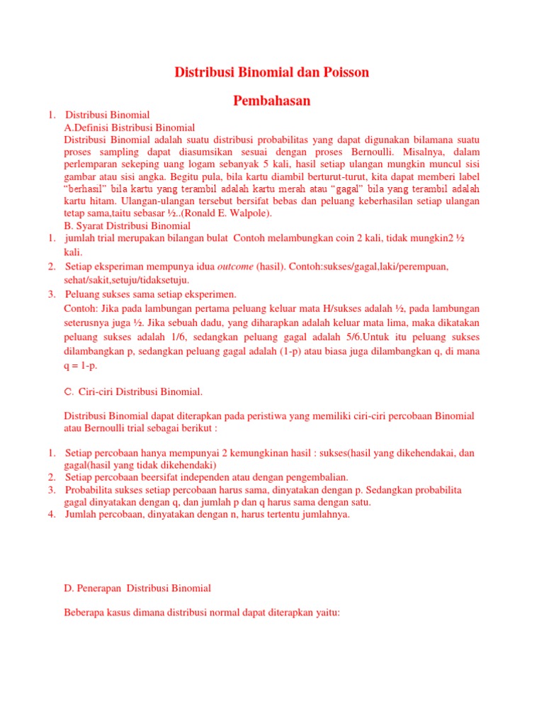 Distribusi binomial binomial distribution merupakan salah satu distribusi dengan variabel acak diskrit yang merupakan kajian dari statistika inferensial. Contoh kegiatan konsumsi kegiatan konsumsi ialah suatu kegiatan yang dilakukan manusia untuk menghabiskan atau menggunakan barang dan jasa guna mencapai kemakmuran hidupnya. Makalah distribusi binomial diajukan untuk memenuhi salah satu tugas mata kuliah probabilitas dan statistika yang di bina oleh bapak adam faroqi st mtoleh. Dalam kehidupan sehari hari kita seringkali berhadapan dengan kondisi yang memiliki dua kemungkinan misalnya seorang ibu melahirkan bayi yang terlahir bisa laki laki atau perempuan saat kita melempar sebuah dadu bilangan yang muncul bisa ganjil atau genap saat kita melempar sebuah koin yang muncul bisa gambar atau angka ketika siswa ujian hasilnya bisa lulus atau tidak lulus. Jika sudah bisa mengidentifikasi hal tersebut maka untuk menghitung sangatlah mudah dengan menggunakan rumus yang telah ada. Academiaedu is a platform for academics to share research papers.