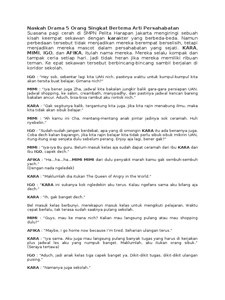 Contoh naskah drama 4 orang singkat tentang persahabatan di sekolah. Contoh naskah drama singkat 5 orang. Ayah ibu nenek ari. Naskah drama 4 orang tema. Arti seorang teman jumlah aktor. Contoh naskah drama 5 orang anda mungkin sedang membutuhkan contoh naskah drama untuk 5 orang pemain jika iya maka berikut ini saya share contoh naskah drama 5 orang pemain singkat.