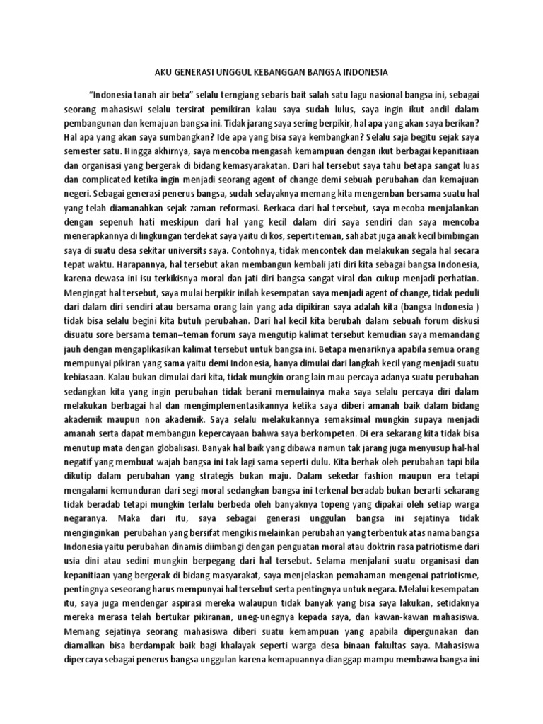 Salah satu contoh essay aku generasi unggul kebanggaan bangsa indonesia. Sebagaimana saya yakin bahwa saya akan menjadi generasi penerus bangsa yang unggul berkualitas dan menjadi salah satu orang yang berartisipasi aktif dalam kemajuan negara indonesia ini. Masih terekam jelas kalimat terakhir dari pembukaan uud 1945 yakni mencerdaskan kehidupan bangsa sebagai bagian dari cita cita bangsa maka selayaknya pendidikan saat ini harus berfungsi untuk mengembangkan kemampuan. 2016 2020 beasiswa unggulan kementerian pendidikan dan kebudayaan. Penerima beasiswa unggulan ini. Tepat adalah penyampaian essay anda sesuai dengan yang mereka harapkan.