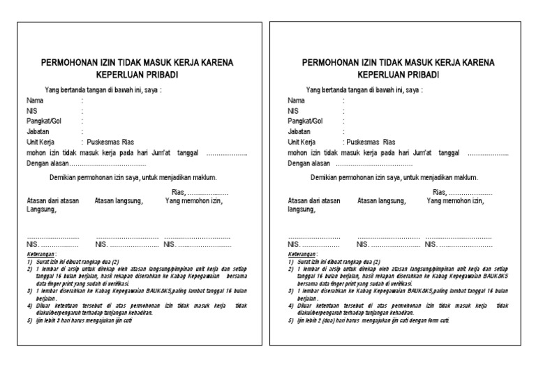 Contoh form izin tidak masuk kerja. Karena berhalangan kerja atau sakit maka biasanya ada toleransi yang diberikan pihak pemberi kerja dengan melakukan pemberitahuan melalui sebuah surat ijin tidak masuk. Surat izin tidak masuk kerja adalah surat izin yang dibuat oleh seorang karyawan suatu perusahaan atau instansi yang ditujukan kepada atasannya yang berisi permohonan izin untuk tidak masuk kerja karena alasan tertentu misalnya karena alasan keluarga yang tidak bisa di tinggalkan misalnya ada anggota keluarga yang meninggal dunia atau musibah lainnya karena sakit karena mau menikah dan. Hal ini ada wajar karena berbagai kegiatan yang menyelimuti kita sehari hari. Hukum menjual barang yang disewakan selama masa sewa. Contoh surat izin sakit pembahasan materi kali ini adalah mengenai cara membuat dan contoh surat izin sakit tidak masuk sekolah kerja dan kuliah. Download contoh format surat izin tidak masuk kerjadoc.