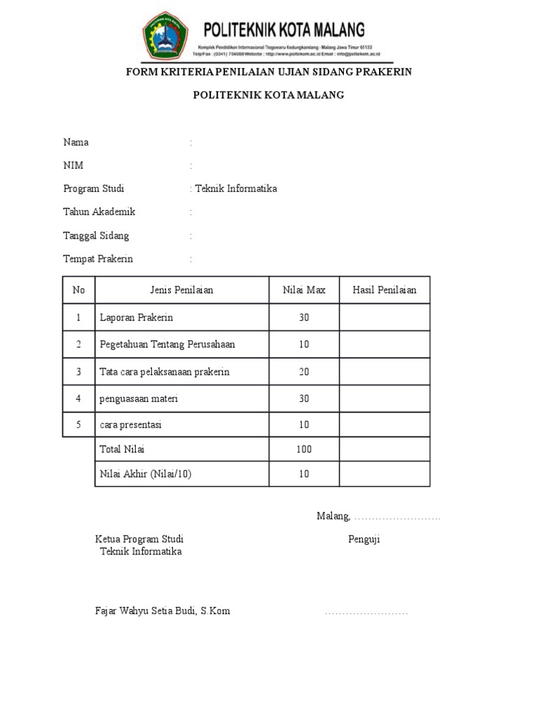 Kantor kecamatan karusen janang. Praktik kerja lapang an. Pelaksanaan dan tanggung jawab atas pekerjaan yang dilakukan. Form nilai praktek kerja lapangan pkl atau riset. Kemampuan melakukan inisiatif dalam pekerjaan 6. Kemampuan bekerja dalam tim 5.