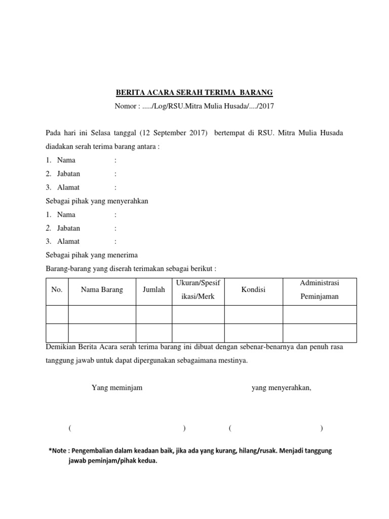 Contoh form serah terima barang. Dokumen surat serah terima barang bisa dikatakan merupakan bukti penting dari suatu proses jual beli antara beberapa pihak yang terlibat. Demikianlah mengenai contoh serah terima barang dengan format yang resmi. Demikianlah berita acara serah terima barang ini di perbuat oleh kedua belah pihak adapun barang barang tersebut dalam keadaan baik dan cukup sejak penandatanganan berita acara ini maka barang tersebut menjadi tanggung jawab pihak kedua memlihara merawat dengan baik serta dipergunakan untuk keperluan tempat dimana barang itu dibutuhkan. Ataukah anda masih bingung bagaimana membuat surat serah terima barang nah kebetulan saya ada contohnya nih mudah mudahan contoh dari saya ini dapat sobat jadikan referensi. Oleh sebab itu penting bagi anda yang berkutat di bidang penjualan distribusi dan sebagainya untuk mengetahui contoh surat serah terima. Makalahid apakah anda tahu seperti apa contoh surat tanda terima barang.