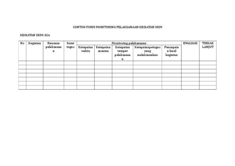 Contoh format monitoring kegiatan. Monitoring adalah pengumpulan informasi secara terus menerus dan teratur yang akan membantu menjawab pertanyaan mengenai proyek atau kegiatanmonitoring membantu mengingatkan ketika terjadi sesuatu yang salah dan membantu agar pekerjaan tetap pada jalurnyamonitoring bertujuan meningkatkan efektifitas dan efisiensi dari sebuah proyek atau organisasi dan didasarkan pada sasaran dan rencana. Pelaksanaan kegiatan ukm puskesmas dilakukan dengan cara mengunjungi tempat pelaksaan kegiatan dengan membawa format monitoring kemudian pelaksanaan kegiatan dipantau apakah sesuai dengan sasaran tempat dan waktu pelaksanaan kegiatan dengan cara mencontreng pada kolom s jika sesuai dan mencontreng ts jika tidak sesuai. Menurut peraturan pemerintah nomor 39 tahun 2006 disebutkan bahwa monitoring merupakan suatu kegiatan mengamati secara seksama suatu keadaan atau kondisi termasuk juga perilaku atau kegiatan tertentu dengan tujuan agar semua data masukan atau informasi yang diperoleh dari hasil pengamatan tersebut dapat menjadi landasan dalam mengambil keputusan tindakan selanjutnya yang diperlukan. Pelatih pramuka telah melaporkan hasil penilaian sesuai format pelaporan yang mencakup aspek sikap pengetahuan dan keterampilan lengkap dengan deskripsinya. Softgaleri adalah blog yang berbagi informasi perangkat akreditasi paket sdmi smpmts smasmkma slb sederajat administrasi kelasakreditasi sekolahperangkat pembelajaran aplikasi dan administrasi guru yang mana file berikut ini adalah kumpulan dari berbagi sumber tentang format monitoring kegiatan ekstrakurikuler yang bisa. Format monitoring kegiatan ekstrakurikuler.