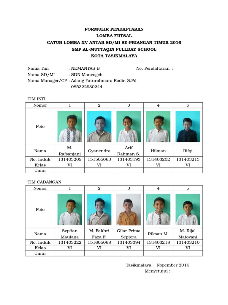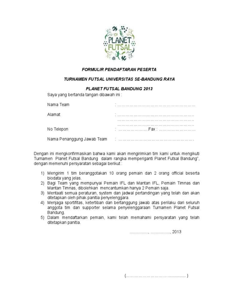 Contoh formulir pendaftaran futsal. Biaya pendaftaran sebanyak rp. Doc formulir pendaftaran anggota gerakan pramuka emma contoh formulir registrasi anggota pramuka baru smp pilpay. Discover everything scribd has to offer including books and audiobooks from major publishers. 300000 uang jaminan rp 100000 7. Formulir pendaftaran peserta futsal fik cup 2017 saya yang bertanda tangan dibawah ini. Ini dia update 2018 dari contoh formulir pendaftaran siswa baru untuk ppdb 2017 2018 materi terkait akan dibagikan lewat postingan hari ini dibagikan dalam format file file yang diambil dari sumber terpercaya dan file tersebut bisa dimanfaatkan oleh guru dalam menampung calon siswai baru yang akan daftar di masing masing sekolah.