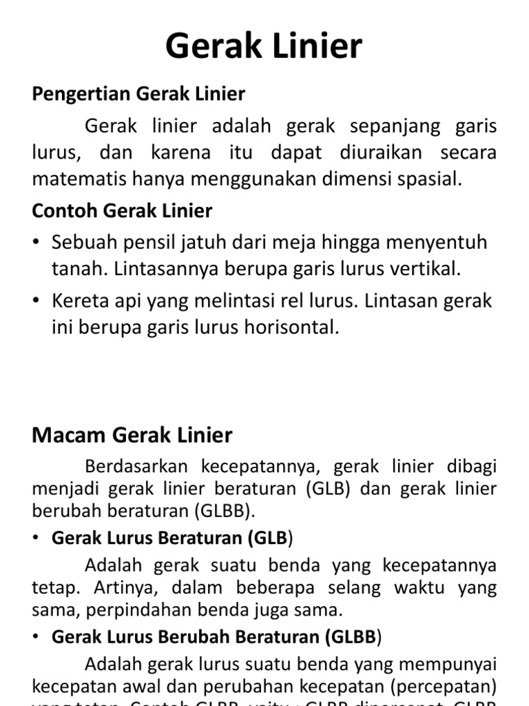 Gerak ini dibedakan menjadi dua jenis berdasarkan ada dan tidak adanya percepatan yakni gerak lurus beraturan glb dan gerak lurus berubah beraturan glbb. Dengan kata lain benda yang melakukan gerak dari keadaan diam atau mulai dengan kecepatan awal akan berubah kecepatannya karena ada percepatan a atau perlambatan a sumber.