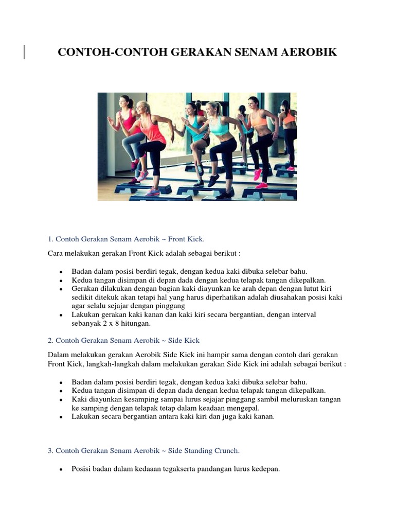 Contoh gerakan dalam senam aerobik senam aerobik menuntut berbagai variasi gerakan yang sangat banyak. Materi penjasorkes bagian senam artikel kali ini membahas tentang senam aerobik. Gerakan pendinginan senam yang dilakukan setelah selesai senam aerobik. Sehingga senam aerobik ini dapat kita artiken sebagai senam yang menggunakan oksigen. Materi makalah teknik senam aerobik meliputi dari beberapa pengertian gerakan bentuk fase teknik gerakan kaki contoh dan gambar supaya mudah di pahami. Skwad how tos memberikan video tutorial fitness workout beauty dan resep yang mudah diikuti.