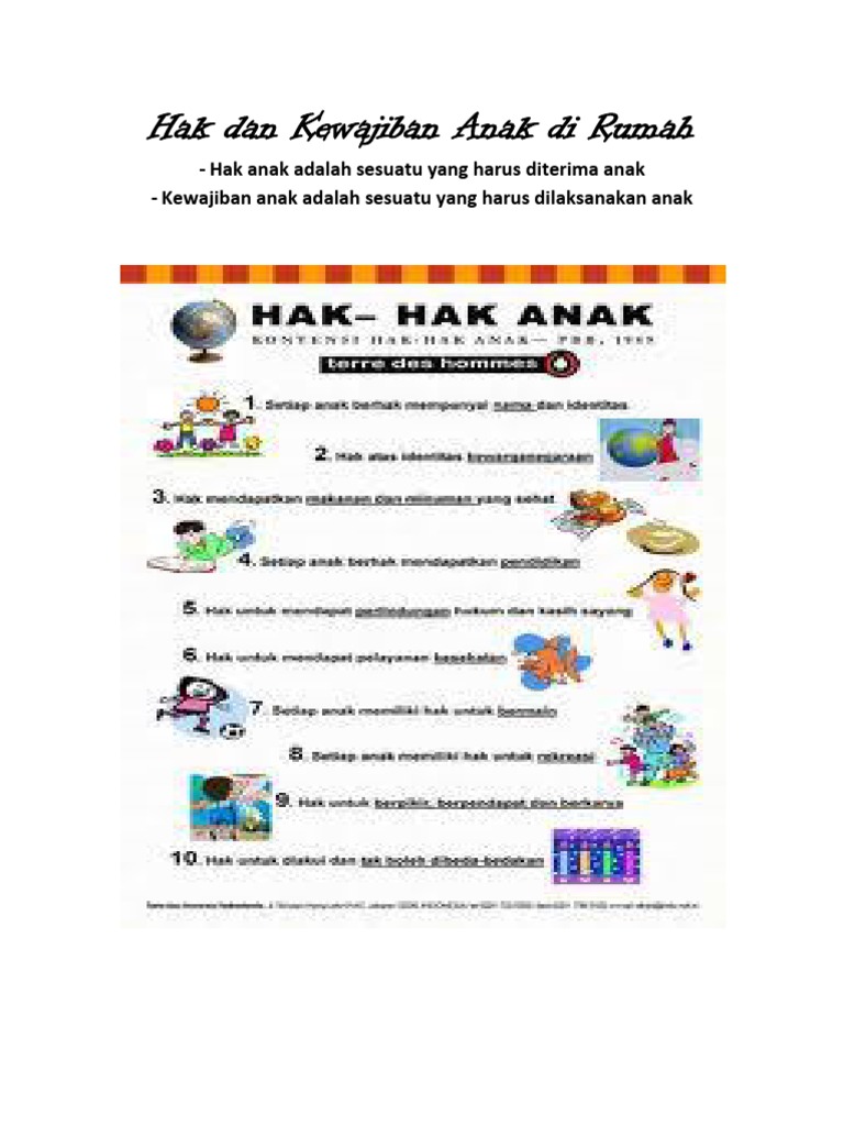 Hak adalah sesuatu yang harus di terima setiap anak memiliki hak hak anak dapat di terima di rumah dan di sekolah. Berikut ini adalah beberapa hak dan kewajiban anak di rumah. 5 contoh hak anak di rumahsekolahdan di tengah masyarakat. Hak untuk diberi kebebebasan atas aktivitas. Setiap manusia diberikan hak dan kewajiban supaya hidupnya dapat berjalan dengan seimbang serta berjalan dengan semestinya. Hak untuk dibimbing dalam.
