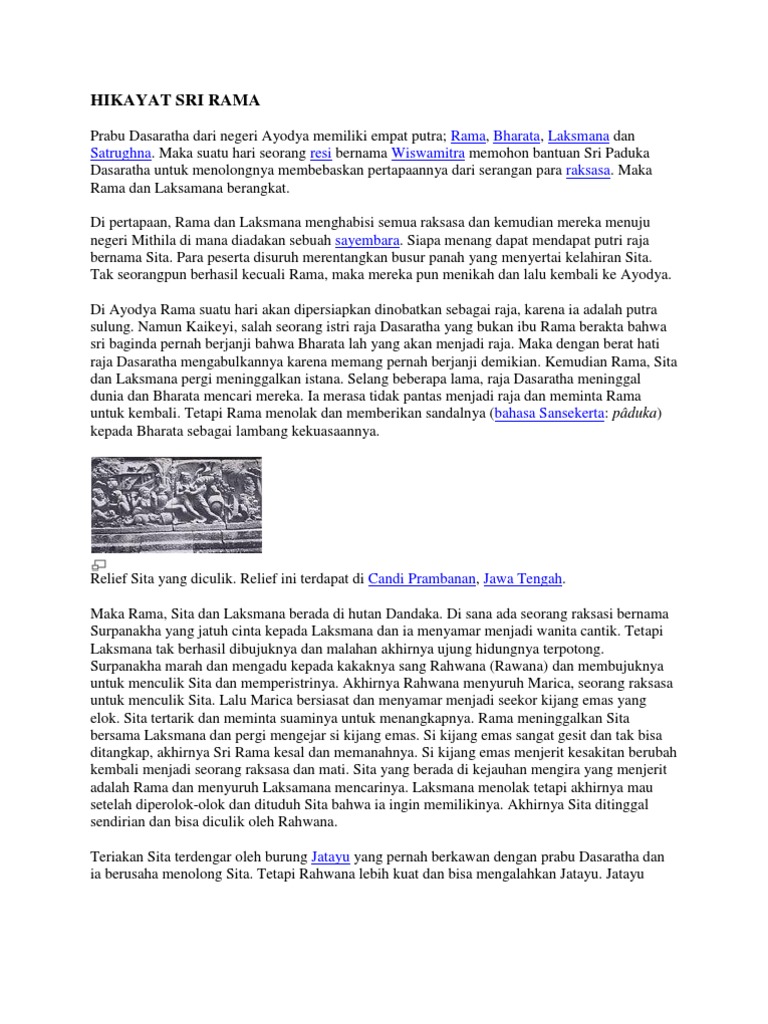 Contoh hikayat sri rama. Hikayat sri rama. Baginda keturunan nabi adam dikatakan turunan yang keempat. Sebagai balas budi sri rama memohon pada dewata mulia raya untuk membuat leher bangau menjadi lebih panjang sesuai dengan keinginan bangau. Namun sri rama khawatir jika leher bangau terlalu panjang maka dapat dijerat orang. Hikayat sri rama pada suatu hari sri rama dan laksamana pergi mencari sita dewi. Saat sri rama dan laksamana berjalan di dalam hutan mereka bertemu dengan seekor burung jantan dan empat ekor burung betina.