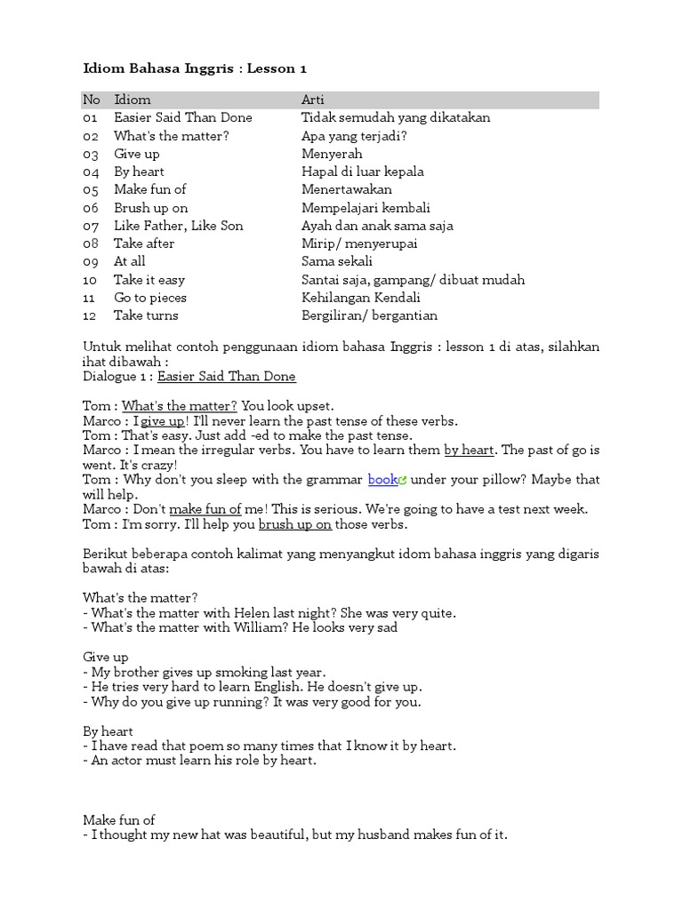 Karena idiom tidak selalu dapat diartikan secara harfiah anda harus mengetahui arti dan penggunaan dari masing masing idiom. Idiom biasanya merupakan kata kiasan. Ini disebut grouping atau chunking teknik menghafal efektif yang menggunakan asosiasi antara kata untuk menyolidkannya dalam pikiran. Ketiganya muncul setiap saat dalam bahasa inggris tertulis dan lisan. Jadi dalam artikel 100 idiom bahasa inggris ini kami sudah membagi idiom ke dalam tema tema umum. 100 contoh idiom dalam bahasa inggris arti makna dan penjelasan lengkap materi bahasa inggris paling lengkap membahas idiom kosakata dan lainnya.