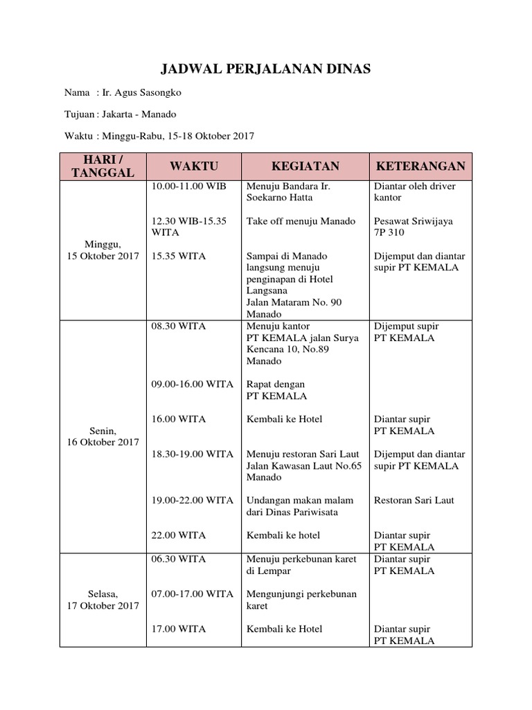 Contoh jadwal perjalanan dinas pimpinan. Jadi tentu saja para pemimpin akan membutuhkan bantuan seseorang untuk meluncurkan tugas tersebut. Ke yogyakarta tanggal 23 24 januari 2013. Contoh jadwal perjalanan dinas pimpinan ke luar kota pemimpin perusahaan memiliki berbagai tugas dan tanggung jawab dalam menjalankan tugas rutin posisinya. Jadwal kegiatan perjalanan bisnis. Berikut informasi sepenuhnya tentang contoh jadwal perjalanan dinas dalam bahasa inggris. Admin dari blog bagikan contoh 2019 juga mengumpulkan gambar gambar lainnya terkait contoh jadwal perjalanan dinas dalam bahasa inggris dibawah ini.