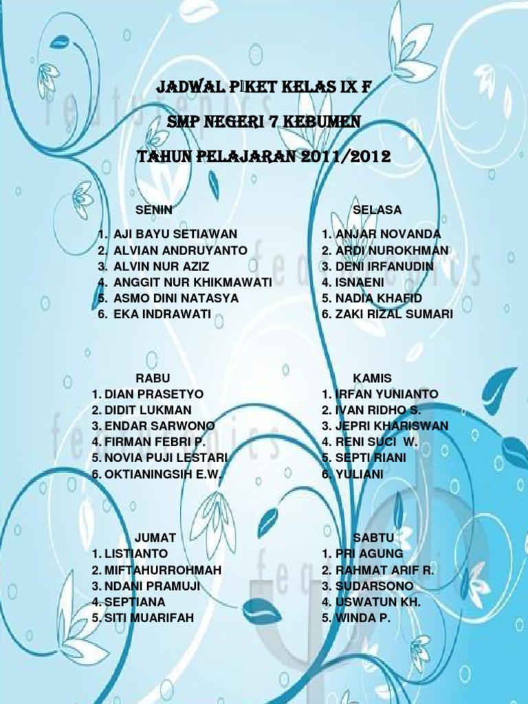 Contoh jadwal piket kelas. Sehingga terciptalah proses belajar mengajar yang nyaman santai dan fokus. Download aplikasi jadwal piket model terbaru dan terlengkap piket kelas adalah kegiatan rutin membersikan kelas yang dilakukan oleh satu kelompok siswa dan bergantian setiap harinya sesuai jadwal jadwal piket sediri dibuat mandiri oleh awlai kelas guru kelas nah untuk membantu membuat jadwal piket yang baik dan benar berikut ini admin bagikan contoh jadwal piket yang baik dan benar dan. Dalam membuat jadwal piket kebersihan kelas bisa menggunakan berbagai media yang anda suka tapi jika menggunakan kertas biasa tentu harus memberi kelebihan dari segi desain yang menarik. Ok langsung saja untuk download desain jadwal piket kelas yang super keren unik keatif dan super gampang editnya silahkan pilih desain kelas yang keren klik link di bawah ini. Cara membuat jadwal piket kreatif menggunakan ms word diawal masuk sekolah biasanya disibukan dengan aktifitas mempersiapkan peralatan kelas pemilihan struktur kepengurusan kelas dan termasuk menyiapkan jadwal piket kelas. Cara membuat jadwal piket kelas yang keren bisa dibuat di excel maupun ms word namun pada kesempatan kali ini kita.