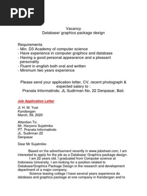 Contoh job vacancy dan application letter. Contoh job vacancy and application letter dalam bahasa inggris lengkap terbaru selamat pagi agan2 semua yang cantik2ganteng2 untuk perjumpaan kita hari ini saya telah membuat sebuah artikel yang dapat berguna bagi agan2 semua yang saat ini sedang memiliki tugas membuat sebuah job vacancy anda application letterlowongan kerja dan surat lamarannya dalam bahasa inggris kali ini saya telah. D3 academy of computer science have experience in computer graphics and database having a good personal appearance and a pleasant. Hak cipta paten merk desain produk desain industri rahasia dagang dan perlindungan konsumen. Jalan merpati number 112 113 jakarta. Contoh application letter dalam bahasa inggris application letter adalah syarat utama dalam melamar suatu pekerjaan. Merger lippo bank dan bank niaga.