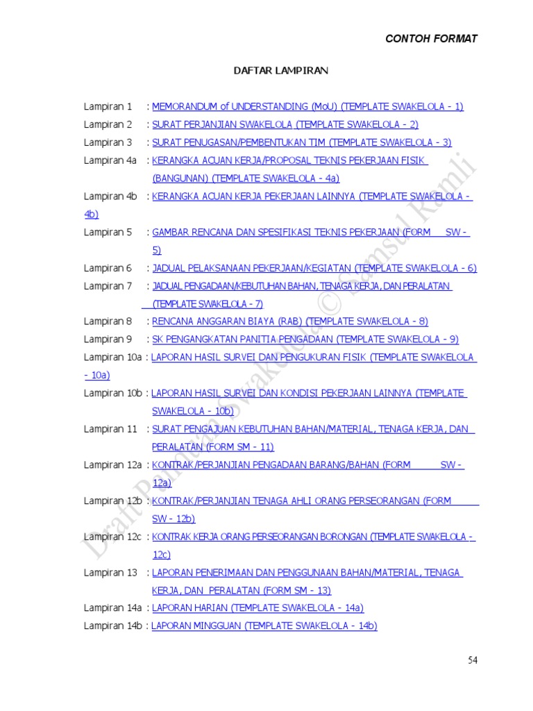 Contoh kak kegiatan swakelola. Program pelayanan administrasi perkantoran dan operasional dalam peningkatan sarana dan prasarana kantor total pagu kegiatan sebesar rp 73900000000 tujuh ratus tiga puluh sembilan juta rupiah. Tujuan kak adalah untuk mendukung agar usulan program kegiatan tepat sasaran sehingga terwujudnya kondisi yang mantap baik dan terawat pada. Berikut di bawah ini kami berikan contoh format kak lengkap untuk semua jenis pekerjaan seperti kak pemeliharaan kak pengawasan kak pekerjaan swakelola dan kak pengadaan barangjasa. Contoh formulir pelaksanaan pekerjaan swakelola dan pelaksanaan pekerjaan dengan penyedia barang jasa a1. Kerangka acuan kerja kak pekerjaan swakelola pemeliharaan drainase gorong gorong dan trotoar 1. Panitia berasal dari klpd sendiri perencanaan dilaksanakan sendiri juga pengawasan dilaksanakan sendiri.