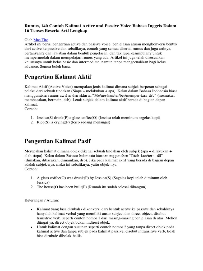 Realitanya kalimat kalimat bahasa inggris itu tidak hanya ditulis atau dibicarakan dengan tense sederhana seperti di atas. Tenses digunakan hampir disemua english skills seperti listening speaking reading dan. Oleh karena itu tenses bahasa inggris juga memiliki bentuk aktif dan bentuk pasif kita harus belajar membedakan antara kalimat aktif dan kalimat pasif untuk berhasil berbahasa inggris dengan baik dan benar. Macam penggunaan rumus dan contoh kalimat 16 macam tenses bahasa inggris. Isinya setiap tenses berisi kalimat aktif dan pasif dan juga nominal dan verbal. Saya mohon maaf jika yang dikatakan saya di atas kurang berkenan.