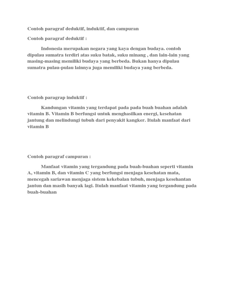 Dimana biasanya penempatan gagasan pada sebuah paragraf terbaituagi menjadi tiga yaitu paragraf deduktif induktif dan campuran. Contoh paragraf yang baik. Demikian contoh contoh paragraf deduktif induktif dan campuran beserta pengertian dan ciri cirinya. Apakah ada ciri ciri khususnya. Tidak hanya contohnya saja yang akan kita sajikan melainkan juga pengertian ciri ciri dan jenis dari 3 paragraf ini. Paragraf deduktif induktif dan campuran merupakan tiga dari jenis jenis paragraf yang ada selain paragraf deskripsi paragraf narasi dan paragraf argumentasiselain itu ketiga paragraf tersebut juga masuk ke dalam jenis jenis paragraf berdasarkan posisi kalimatnya selain paragraf ineratifketiga paragraf tersebut mempunyai sejumlah perbedaan yang akan dibahas pada artikel kali ini.