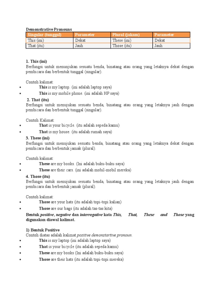 Pengertian dan 25 contoh kalimat demonstrative pronoun demonstrative pronoun adalah kata ganti yang mengarah pada jumlah number dan jarak distance. Pronoun dalam bahasa indonesia memiliki arti kata ganti. Semua itu tergantung konteks kalimatnya dan kita akan belajar lebih banyak contoh penerapan demonstrative pronoun dalam kalimat pada poin berikutnya dari artikel ini. Tedi is a good boy. Demonstrative pronoun dan demonstrative adjective memiliki bentuk yang identik namun dengan peran yang berbeda pada kalimat. Noun yang digantikan oleh demonstrative pronoun biasanya berupa benda orang maupun hal lainnya.