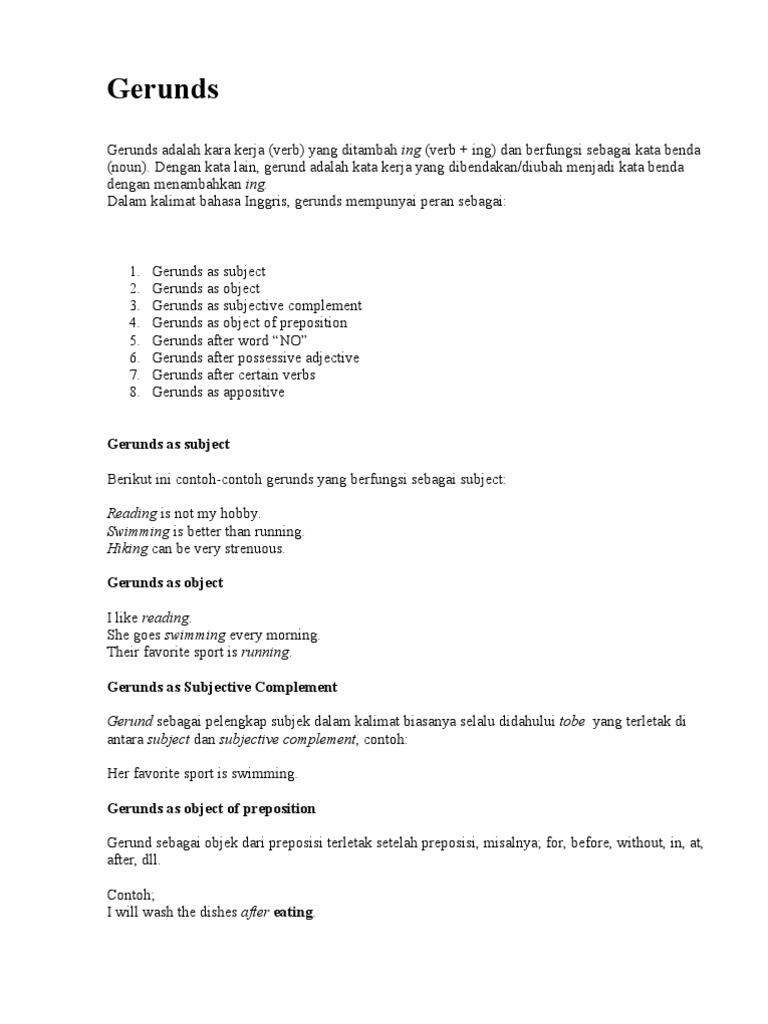 Subject dari sebuah kalimat his hobby is swimming. Abdul enjoys not working. Contoh kalimat komplex sentence. Binging adalah fase yang sering dilakukan oleh seorang bulimiarunning may be hard for some people. Berlari mungkin sulit bagi sebagian orang direct object. Contoh kalimat conditional sentence type 2.