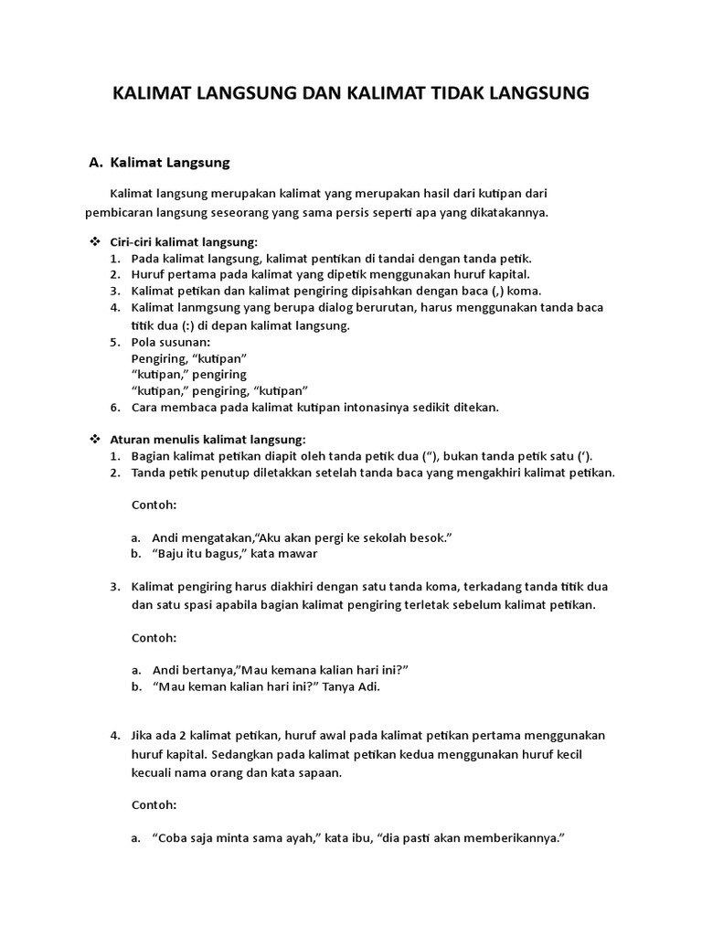 Contoh kalimat langsung dan tak langsung. Budi berkata bahwa ia sangat lapar. Oleh itu saya akan memberikan informasi terkait dengan jenis pertanyaan soal bahasa indonesia dengan materi kalimat langsung dan tak langsunginilah garis besar penilaian tentang kalimat langsung adalah sebuah kalimat yang disampaikan langsung. Sedangkan kalimat tak langsung merupakan kalimat yang megutarakan kembali isi perkataan seseorang tanpa mengulangi perkataan yang diucapkannya sebelumnya. Kalimat langsung dan kalimat tidak langsung tentu memiliki ciri ciri hingga kaidah penulisannya masing masing. Karya tulis ilmiah makalah laporan dan lainnya itu tidak terlepas dari kutipankarena sesuatu argumen yang terdapat dalam penulisan harus didukung dengan teori yang ada untuk meyakinkan si pembaca tersebut. Posting pada sd ditag 20 contoh kalimat berita 5 contoh kalimat langsung bahasa sunda apa yang dimaksud dialog buatlah 5 kalimat tidak langsung kemudian ubahlah menjadi kalimat langsung buatlah 5 kalimat tidak langsung ubahlah menjadi kalimat langsung buatlah kalimat dengan kata gabung sehingga cara langsung dan tidak langsung ciri ciri.