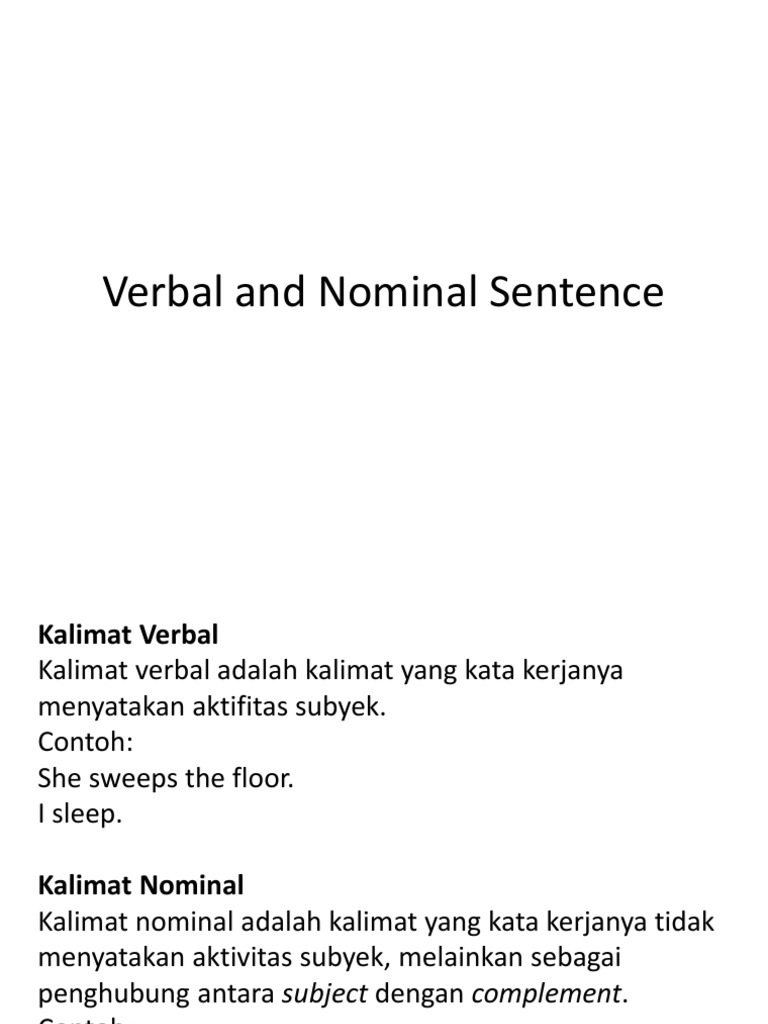 Sesuai dengan namanya yaitu adanya verb alias kata kerja dalam bahasa inggris. Kalimat nominal nominal sentence adalah kalimat yang tidak mengandung kata kerja atau dengan kata lain kalimat nominal adalah kalimat yang predikatnya bukan kata kerja tetapi berupa kata benda noun. Mereka penari yang terkenal they are not a famous dancers. Contoh verbal sentence menggunakan simple future tense. Perhatikan contoh contoh kalimat berikut ini dan bedakanlah dengan kalimat verbal. Pengertian contoh kalimat nominal dan verbal sentence dalam bahasa inggris dikenal istilah sentence classification yang artinya pembagian kalimat.