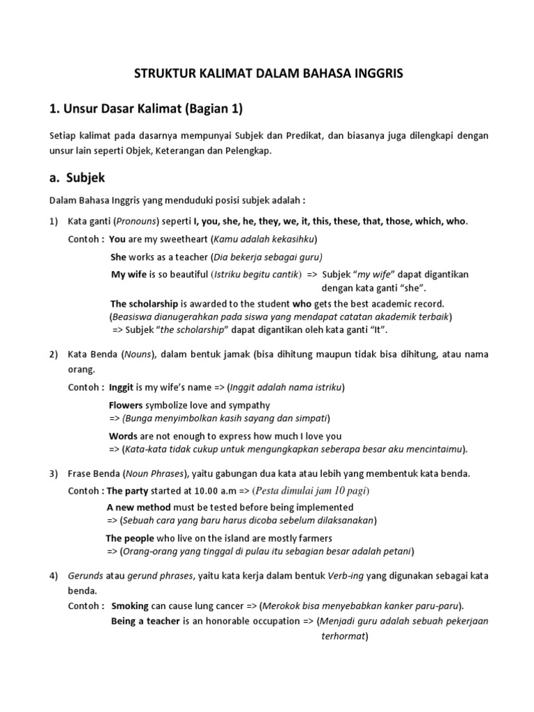 Ada banyak jenis objek yang dapat diaplikasi pada sebuah kalimat contohnya objek kata benda seperti alat musik rumah bunga dan lainnya. Obek dapat digunakan pada awal atau di akhir kalimat. Sejatinya objek merupakan salah satu kompenen penting yang dalam membuat sebuah kalimat sehingga akan membentuk sebuah informasi yang lengkap. 37 contoh kalimat bahasa inggris menggunakan noun beserta artinya lengkap hallo sahabat kbi pada kesempatan kali ini admin akan membahas megenai contoh kalimat dalam bahasa inggris yang menggunakan. Salah satu problem yang dihadapi oleh mereka yang belajar bahasa inggris adalah tidak bisa membedakan subjek sehingga bingung memahami maksud kalimat. Contoh kalimat spok suatu kalimat yang baik dan benar akan memiliki unsur antara lain pelaku subjek s kata kerja predikat p yang dikenai pekerjaan objek o keterangan k hingga pelengkap p.