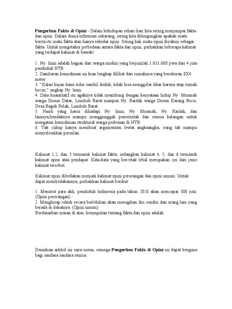 Contoh kalimat fakta dalam pertemuan yang sebelumnya kita sudah menyimak pembahasan secara rinci mengenai kalimat opini. Dengan kata lain masyarakat memiliki pandangan yang sama mengenai suatu kejadian sehingga tidak ada pro dan kontra. Sering mandi di malam hari dipercaya dapat menyebabkan penyakit rematik. Tetapi tidak semua informasi tersebut berupa sebuah fakta. Mandi malam dapat menyebabkan rematik banyak orang yang mempercayai tentang pendapat ini meskipun belum ada fakta ilmiah mengenai hal. Contoh kalimat opini didalam sebuah berita atau wacana terdapat banyak sekali informasi yang ada didalamnya.