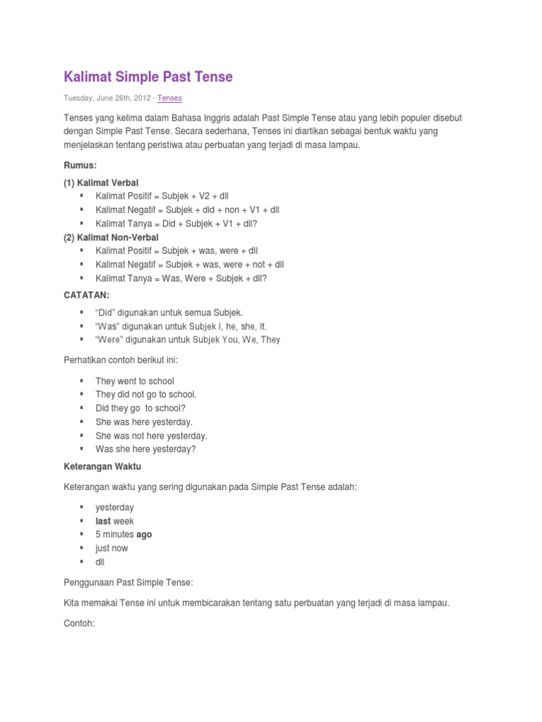 Contoh kalimat simple past tense nominal atau non verbal. Subject did not infinitive verb object atau subject waswere not adjectiveadverb. Contoh kalimat verbal dan non verbal simple future tense simple future tense adalah salah satu keterangan waktu dalam bahasa inggris yang menerangkan peristiwa atau kejadian yang akan terjadi atau akan dilakuakan dimasa depan. Kalimat verbal verbal sentence adalah kalimat yang mengandung kata kerja verb atau dengan kata lain kalimat verbal itu adalah kalimat yang predikatnya adalah kata kerja verb. Kalimat verbal dan non verbal. Dulu saya pikir kalimat simple past tense hanya menggunakan kata kerja past tense alias verb 2 saja. Kata kerja ini biasanya digunakan ketika ingin mengatakan sebuah keinginan membuat suatu perdiksi atau digunakan ketika hendak mengatakana sebuah kalimat pengandaian.