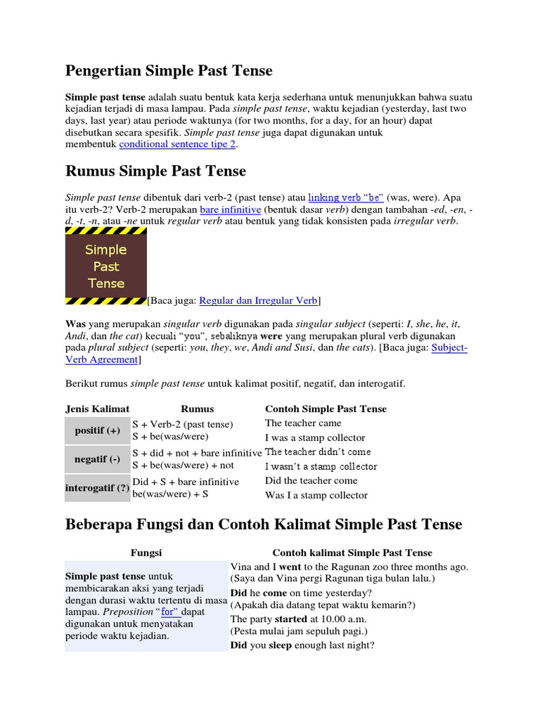 Kata kerja verb 2 ini adalah salah satu dari serangkaian artikel tentang simple past tense. Dulu saya pikir kalimat simple past tense hanya menggunakan kata kerja past tense alias verb 2 saja. Ada aturan aturan yang harus diterapkan pada setiap pembentukan frasa atau kalimat. Bahwasannya telah dituliskan pada bentuk perubahan irregular verb dari verb 1 ke verb 2 dan 3 hanya perlu menambahkan kata edd saja pada akhir kata. Saya pergi ke sekolah setiap pagi she studies english in the class. Verb 2 verb bentuk ke 2 digunakan untuk menjelaskan suatu peristiwa yang telah terjadi di masa lampau.